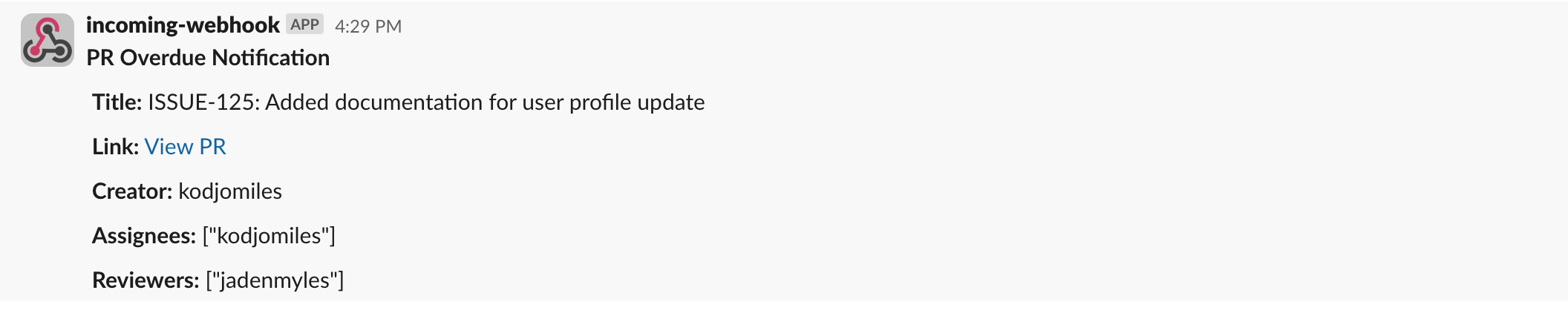 Hereโ€™s an example of the Slack message youโ€™ll receive when a PR has been open for more than 3 days: