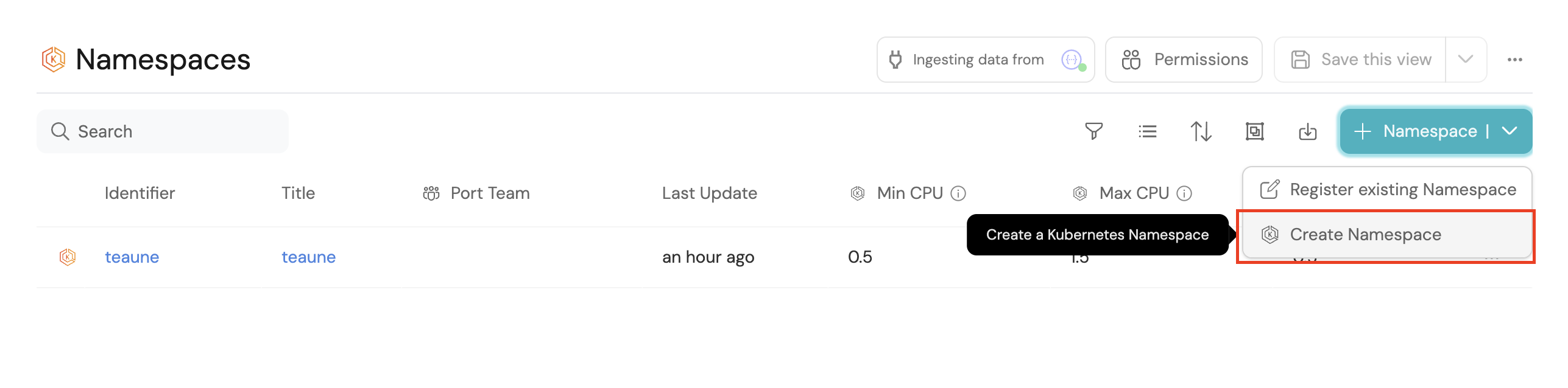 3. Choose the Create Namespace option