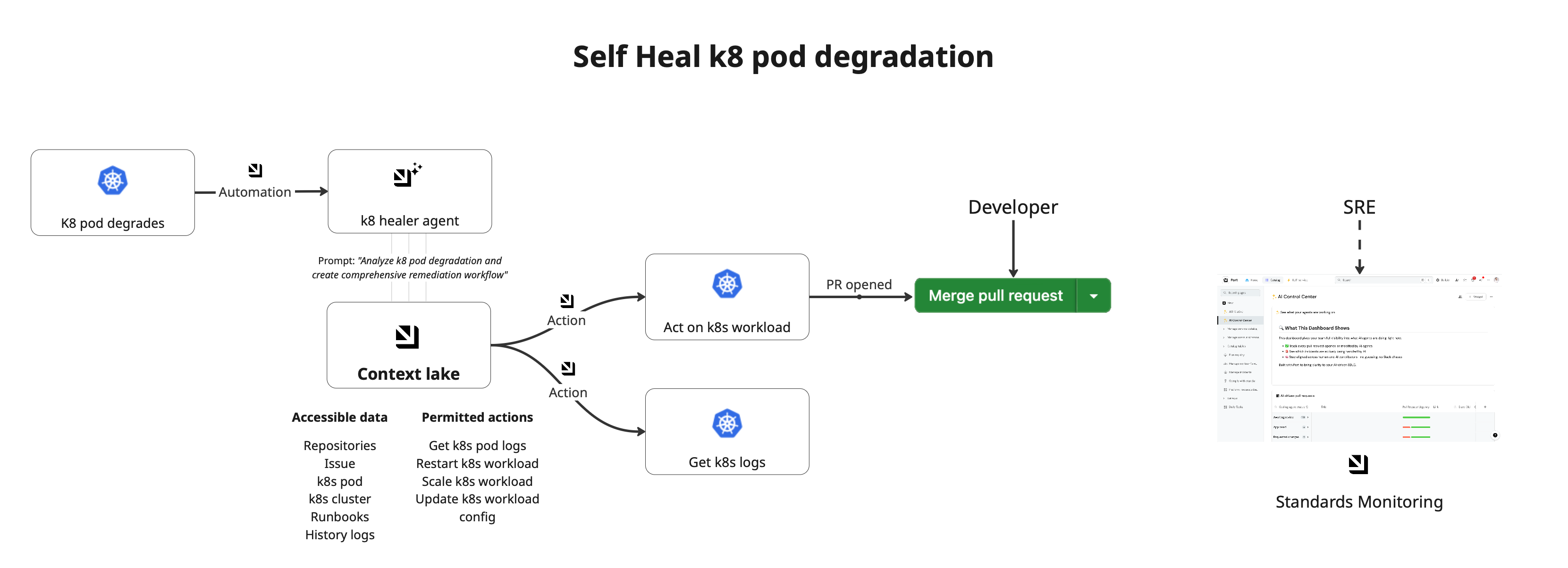 This guide demonstrates how to create an AI-powered system that automatically detects unhealthy pods, analyzes their logs and SDLC context, and triggers targeted remediation actions to restore service health.
