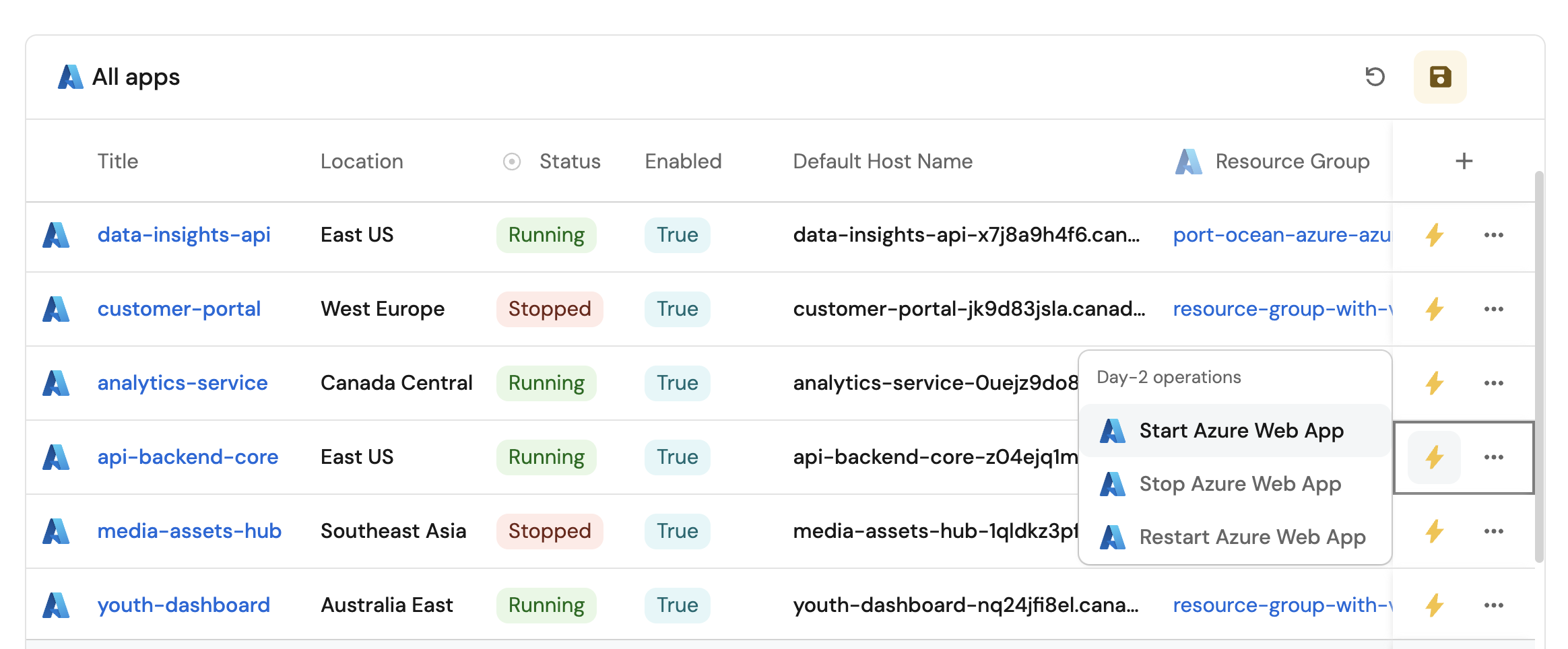 With your data and actions in place, we can create a dedicated dashboard in Port to visualize all Azure web apps by status, location, and resource group. In addition, we can trigger actions (start, stop, restart) directly from the dashboard.