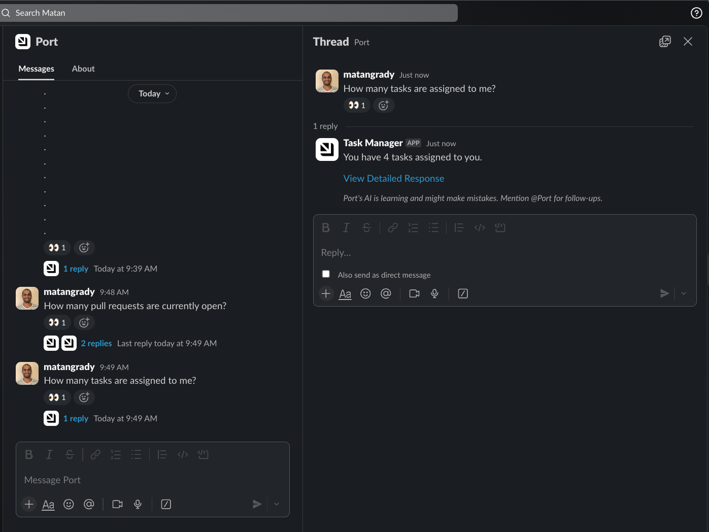 By the end of this guide, your developers will be able to get information about their tasks via Port's AI chat.