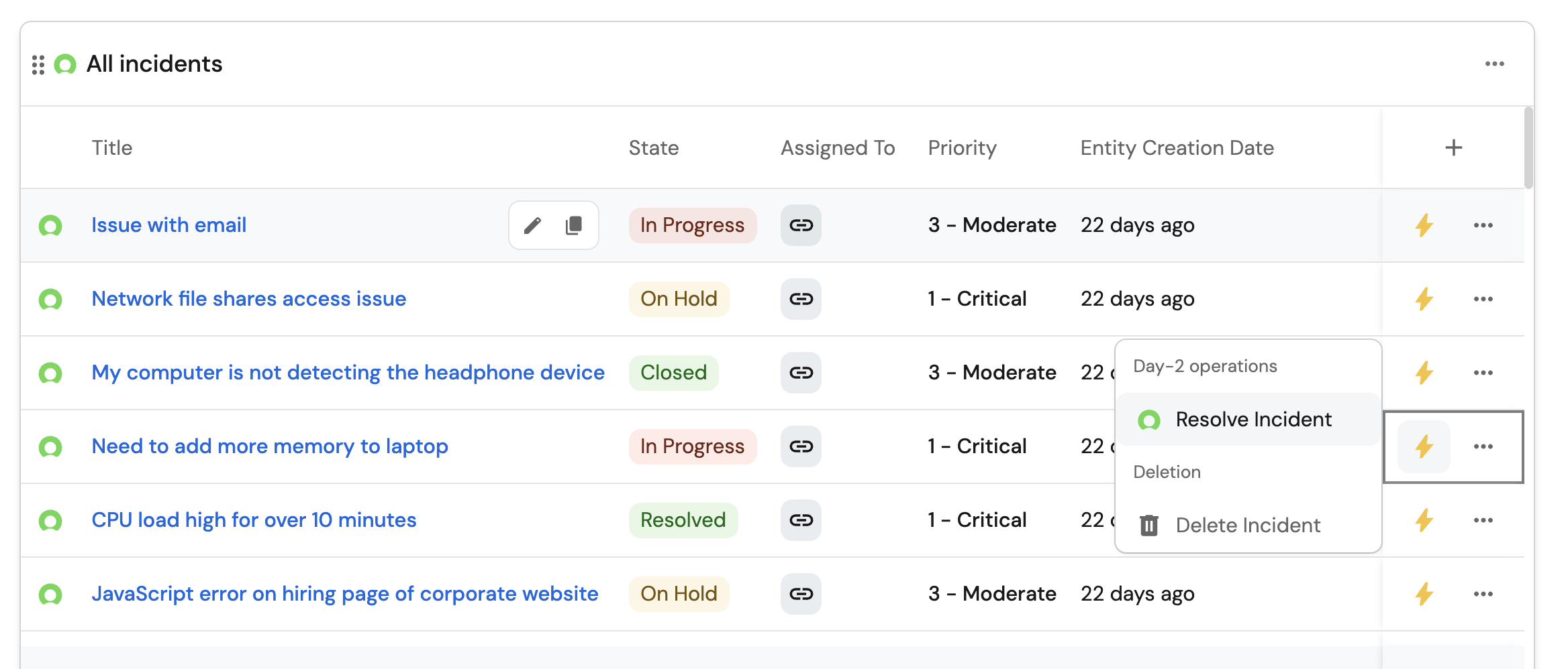 • Set up self-service actions to manage incidents (create, resolve, and delete).