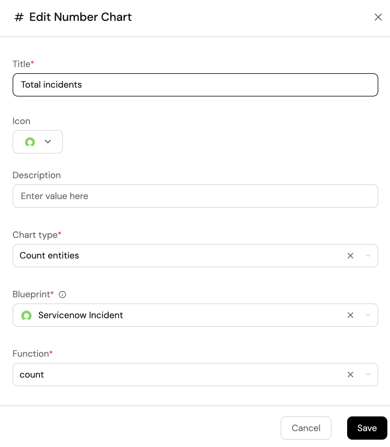 3. Select Count entities Chart type and choose ServiceNow Incident as the Blueprint.
